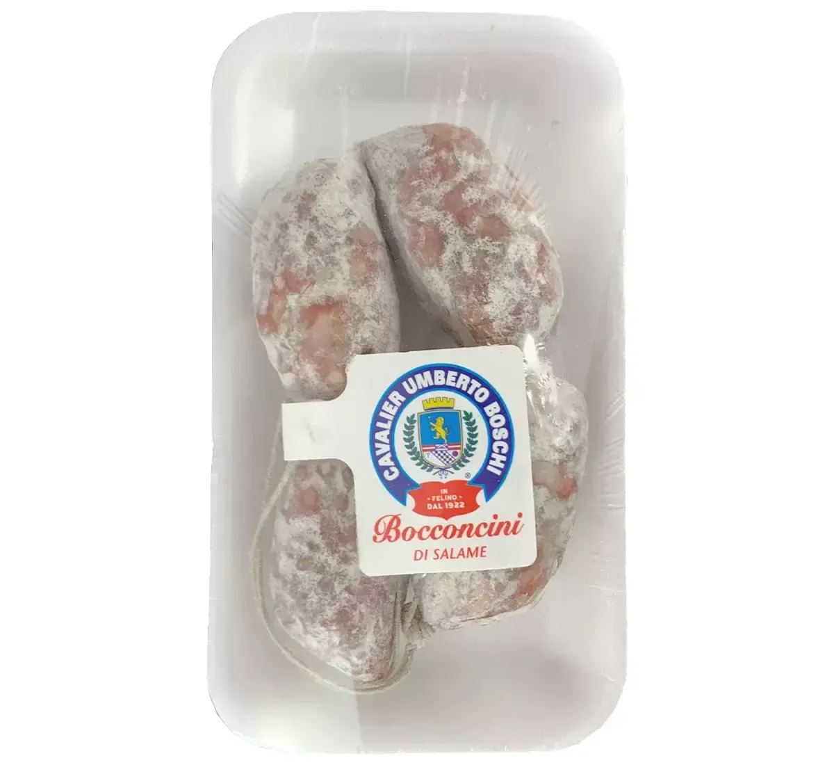 I Bocconcini di Salame del Cavalier Umberto Boschi sono una versione sfiziosa del tradizionale Salame di Felino IGP, preparati con pura carne suina italiana, pepe nero in grani e Malvasia dei colli di Parma. Realizzati con il pregiato trito di banco, sono legati a mano e brevemente stagionati, perfetti per aperitivi e taglieri ricchi di gusto.