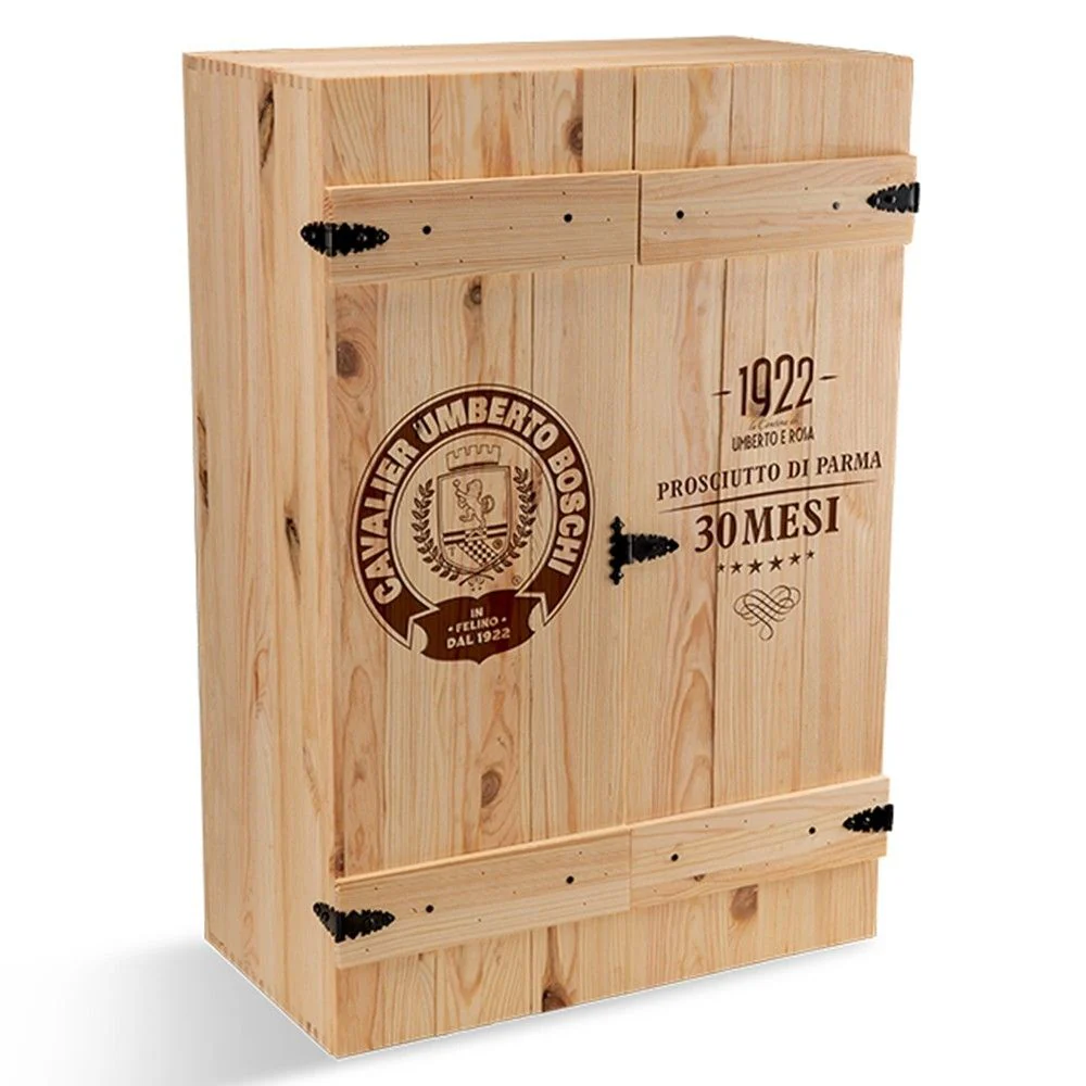 Il Prosciutto di Parma DOP stagionato 30 mesi, firmato Cavalier Umberto Boschi, è un’eccellenza assoluta della salumeria italiana, realizzata secondo tradizione nella zona collinare di Parma. Intero, con osso e custodito in un’elegante cassa di legno, offre un sapore dolce e naturale, frutto di una lunga stagionatura artigianale.